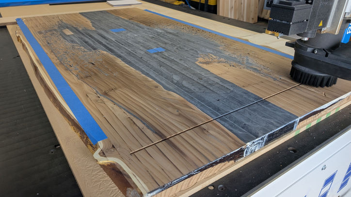 We used our CNC to flatten this epoxy & raw wood table, then cut out custom holes for the table hardware.